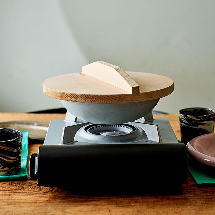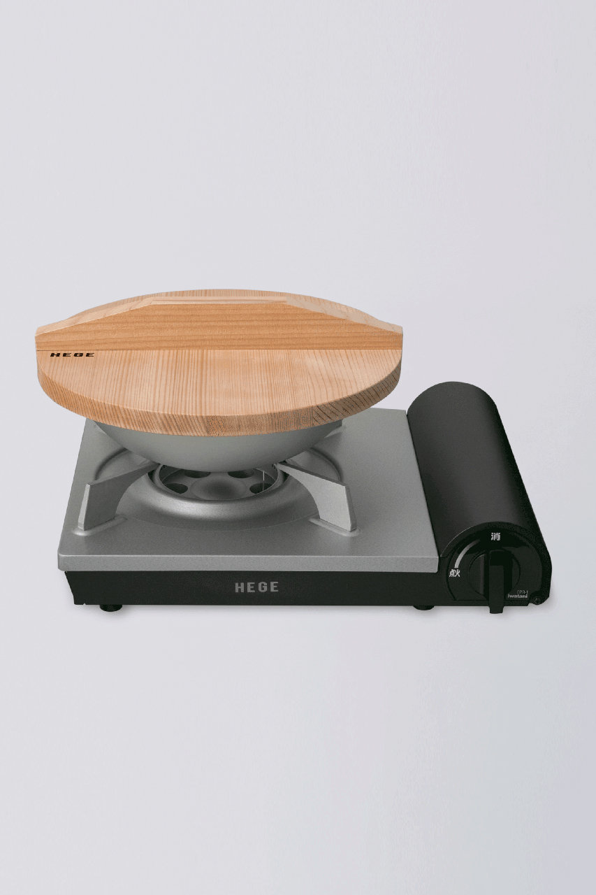 Φ250直火鍋に、耐水性・耐湿性に優れた丈夫な日本製・木曽産のさわら材を使用した「ヘゲ」オリジナルさわら木蓋、さらに、「ヘゲ」のレーザー刻印を施した卓上こんろ「イワタニ カセットフー エコプレミアム」をセットに。持ち運びに便利なオリジナルオーガニックコットン専用袋付きです。