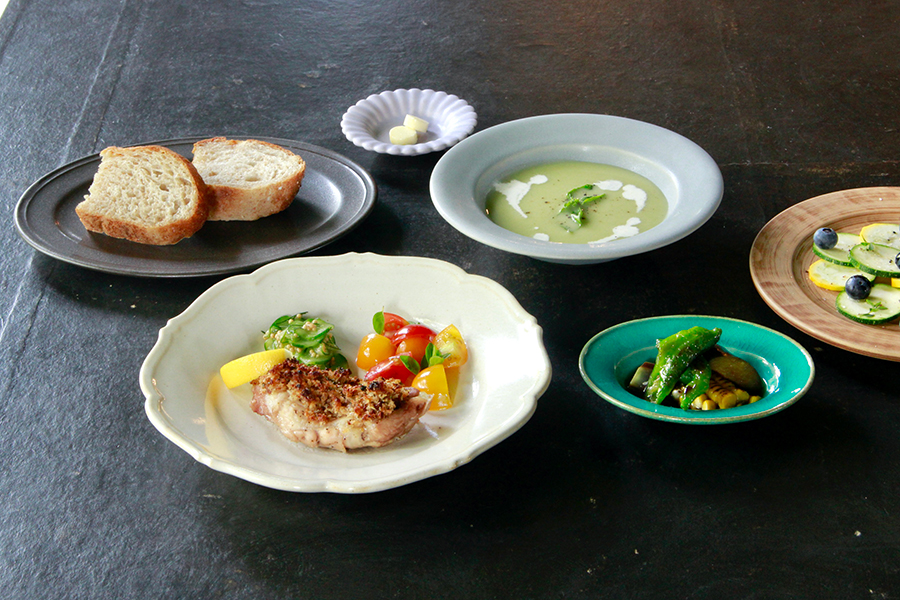 窯元の魅力に光を当て、産地の特性を生かしたうつわを扱う「アメノイエ」。愛知県常滑市で作陶されている山源陶苑で生まれた「マレ」は、楕円プレートと八角プレート、白とグレーがかったブルーの2色展開で、広めのリムで料理が映えるデザイン。
