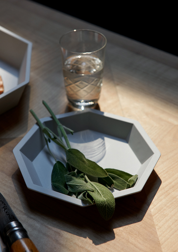 柳原照弘による、有田焼の伝統を踏襲しながらも新しいデザインアプローチを試みる「1616/アリタジャパン」のTYシリーズは、薄みがかったグレー色がスタイリッシュ。ミニマルな八角のフォルムのプレートや、リムがアクセントになっているラウンドボウルは、品が良く、料理のグレードを引き上げてくれます。