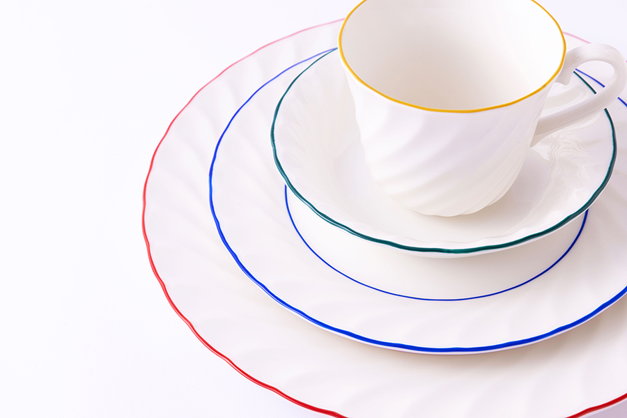 喫茶店などで愛用されてきたシリーズ食器と手描きの絵付け技術をかけ合わせた、どこか懐かしくも新しい「レスポワール」シリーズ。美濃の光洋陶器が昔から生産していた食器をベースにラインを入れてレトロ喫茶風に。遊び心が感じられるデザインの裏印もポイント!