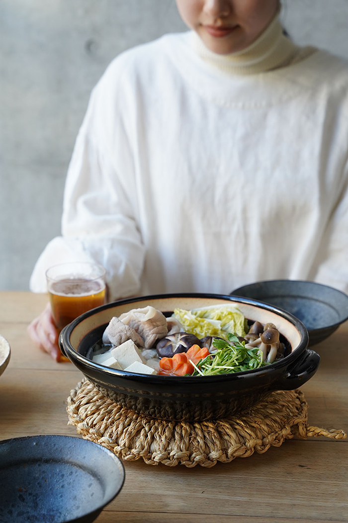 土鍋はデザインや雰囲気も重視して選びたい。150年続く「カネダイ陶器」の土鍋や行平鍋は、伊賀焼ではおなじみの「天目釉」と呼ばれる鉄分を多く含んだ光沢感のある黒色が特徴。ゆっくり火が入るため、本来の食材の味を生かした美味しい鍋料理を楽しめます。淡路島で作られる人気の「あわびウェア」のココット鍋は、フリルのような大きな持ち手が付いたエレガントなデザイン。おしゃれな見た目で食卓への登場回数が増えそう!