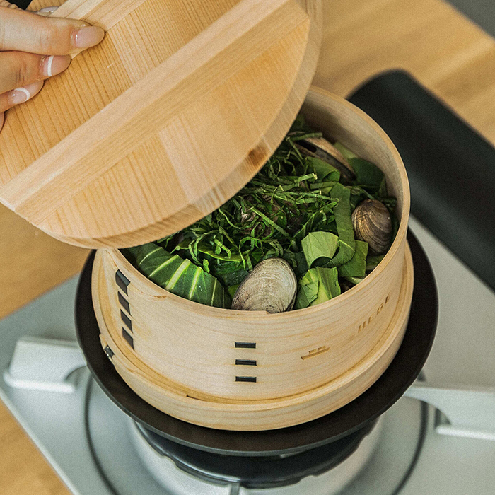 本格的なせいろに野菜や肉、きのこなど好きな具材を入れてヘルシーな蒸し料理を楽しんで。「にちにち道具」の和せいろは、重みのある蓋で蒸気を閉じ込めるので、中華せいろより早く蒸し上がるのが特徴。「HEGE/ヘゲ」からは人気の調理器具ブランド「釜浅商店」とのWネームのミニ和せいろと、サイズがぴったりな直火ボウルとのセット。どちらも扱いやすく簡単に蒸し料理が楽しめます!