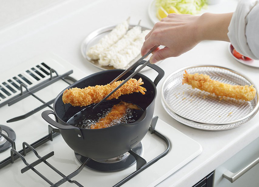 揚げ物をするならこれ! 「アイカタ」の揚げ鍋は、ボリュームのあるカツやエビ、魚のフライ等も余裕をもって調理でき、使用後はコンパクトに収納できる楕円形のフォルム。小ぶりながら深さがあるので、油ハネしにくいのも嬉しい! 揚げ物へのハードルをぐっと下げてくれる頼もしい存在です。