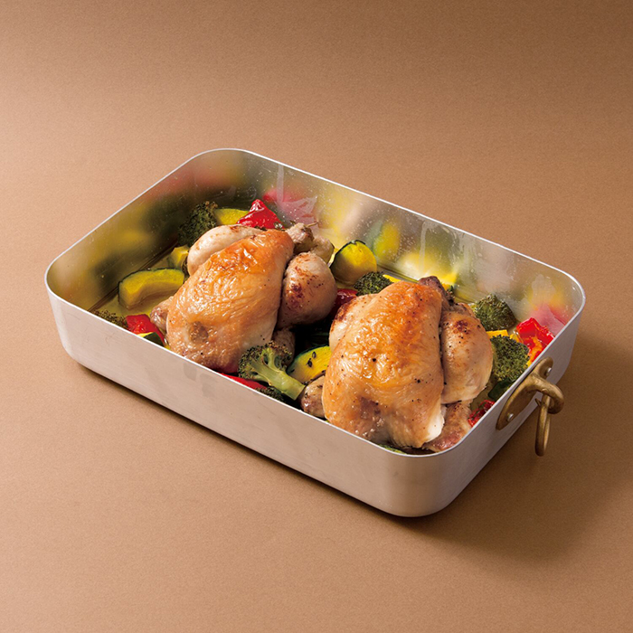 オーブン調理したものを、あたたかいまま食卓へ! 「Regas/レガス」の素焼きのパエリアココットはアヒージョやグラタン、煮込み料理に。レクタングル型はクラフティのようなスイーツにも。イタリアの「Ottinetti/オティネッティ」のアルミ製のレクタングルベイカーは、側面に真鍮のリングが付いていて見た目もおしゃれ。熱伝導率が良いのが特徴で、ラザニアやグラタン、肉や魚のローストに。