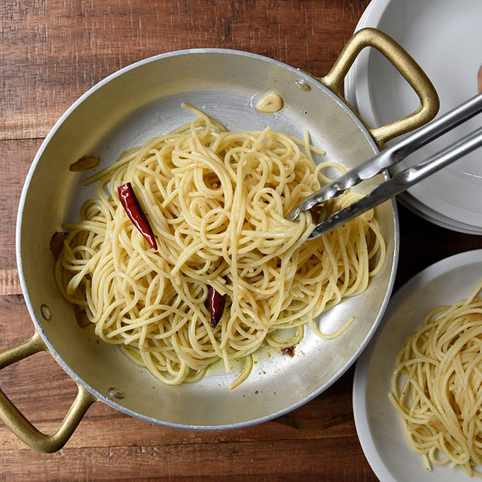 イタリアブランド「Ottinetti/オティネッティ」のアルミ製の調理器具は、直火やオーブンで調理したら、アツアツのまま食卓に出せる優秀アイテム! たたずまいが洗練されていて、真鍮のハンドルもおしゃれ。きっとゲストからも歓声が上がるはず!