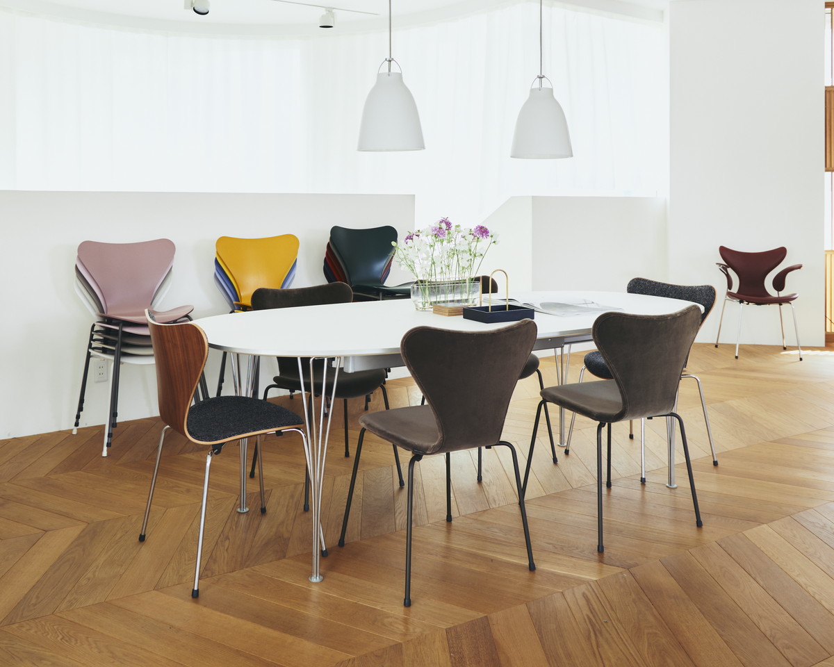 自然光が降り注ぐ美しい空間で北欧の名作家具に触れられるFRITZ HANSEN TOKYO。ホームユースだけでなく、オフィスにも使用できるフレキシブなデザインであることもこのブランドの大きな魅力です。オフィス開設を検討している人もぜひ立ち寄ってください。