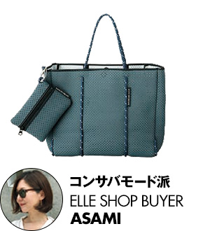 「デニムプリントが着こなしのポイントになる“プティガイズ”が日々大活躍。ほどよい小ぶりサイズや2ウェイ仕様もポイント高い。出張のときにもコンパクトに折りたたんでもっていけるので、旅先でもヘビロテ中です!」