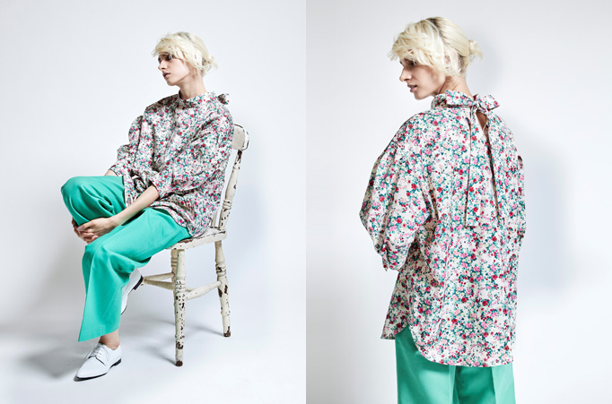 こちらも手捺染によるオリジナルプリント。11色のカラーを使って柄に奥行きを出しています。120/2の細番手のブロードを使用した、しなやかで肌触りもシルキーな上質な素材使いのブラウス。オフホワイトとブラックの2色展開。