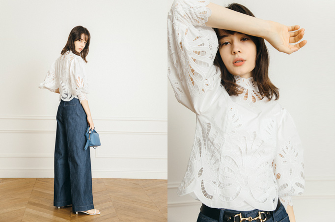 「SUN」からご紹介するのは、ハリ感のあるコットンに全面手作業でカットワーク刺しゅうを施した、非常に手の込んだブラウス。コンパクトな身頃にボリュームのあるパフスリーブが印象的な一枚です。デニムと合わせてカジュアルにも、落ち感のあるボトムスと合わせてフォーマルな場面でも活躍してくれそう。