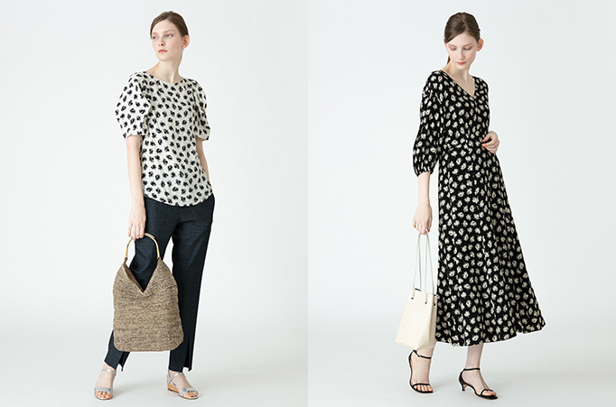 「『アルアバイル』からは、モノトーンカラーのフラワープリントコーディネートにで取り入れやすいブラウスとワンピースを。ブラウスは変形のタックスリーブで甘くなりすぎず、またシワになりにくいサラッとした素材なのでTシャツ感覚で着ていただけます。ワンピースはVネック襟元と胸下の切り替えで、リラックスした着心地なのにすっきりと見えるデザイン。袖口にもゴムシャーリングが入り、とにかく着ていて楽ちんです!」