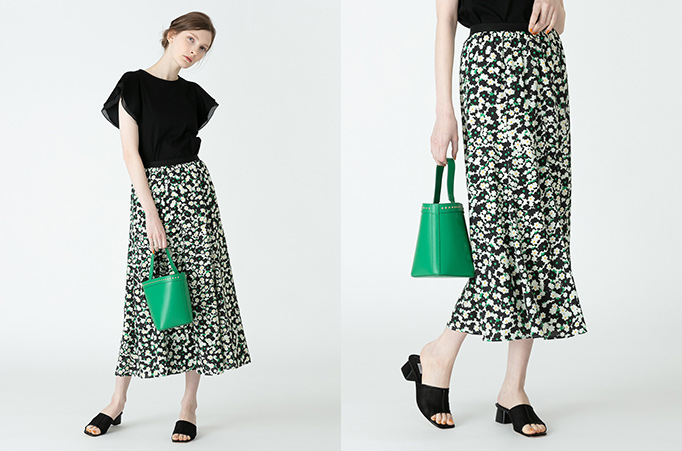 「『LOULOU WILLOUGHBY』ではグリーンが差し色のデイジープリントをシンプルなマーメイドスカートに。タイトなトップスでシンプルにも、ロゴTやカラートップスを合わせても◎」。