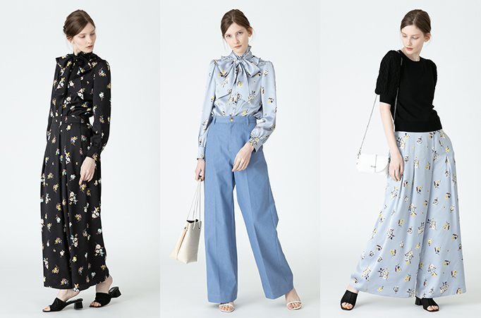 「名品アイテムのフリルボウタイブラウスは、ヴィンテージフラワープリントでとっておきの一枚にアップデート。アシンメトリーシルエットとボリューム感で、パンツとセットアップで着用すれば華やかなシーンにも、単品でコーディネートの主役としてもスタイリングを楽しめます」。