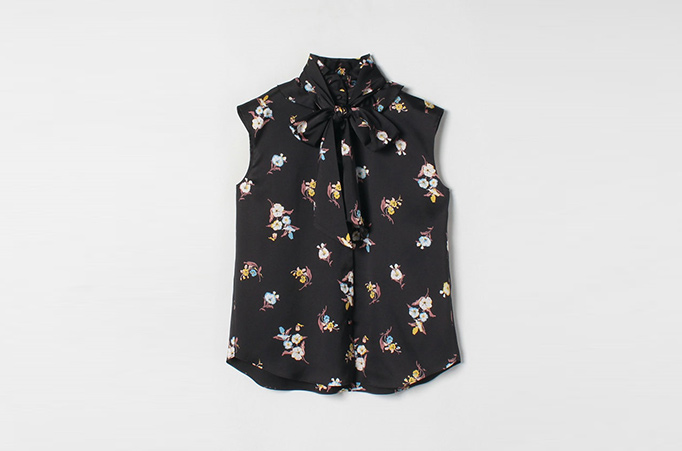 ヴィンテージ感溢れるフラワープリントのブラウスは、大ぶりのリボンタイが大人かわいいを演出。