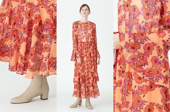 くっきりと描かれた色鮮やかな花柄のインポート生地を使用したワンピース。着るだけで気分が上がる1枚です。ポリエステルの揺れるシフォンにプリントし、立体感と華やかさを演出。素材の軽さを生かして、袖と裾にフレアの切り替えを入れることで、動くたびに軽やかに揺れるのがエレガントな印象に。