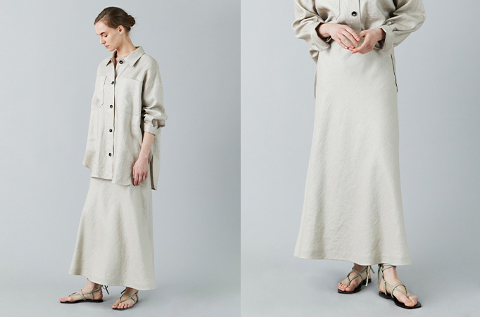 腰周りはすっきり、足元に向かってフレアラインが美しいリネンスカート。ウエストの後ろはゴム仕様でリラックス感があります。オーバーサイズなリネンCPOジャケットと女性らしいシルエットのリネンスカートはセットアップで着ていただくのがおすすめ。お手持ちのアイテムと合わせても、女性らしさを格上げしてくれる一品です。