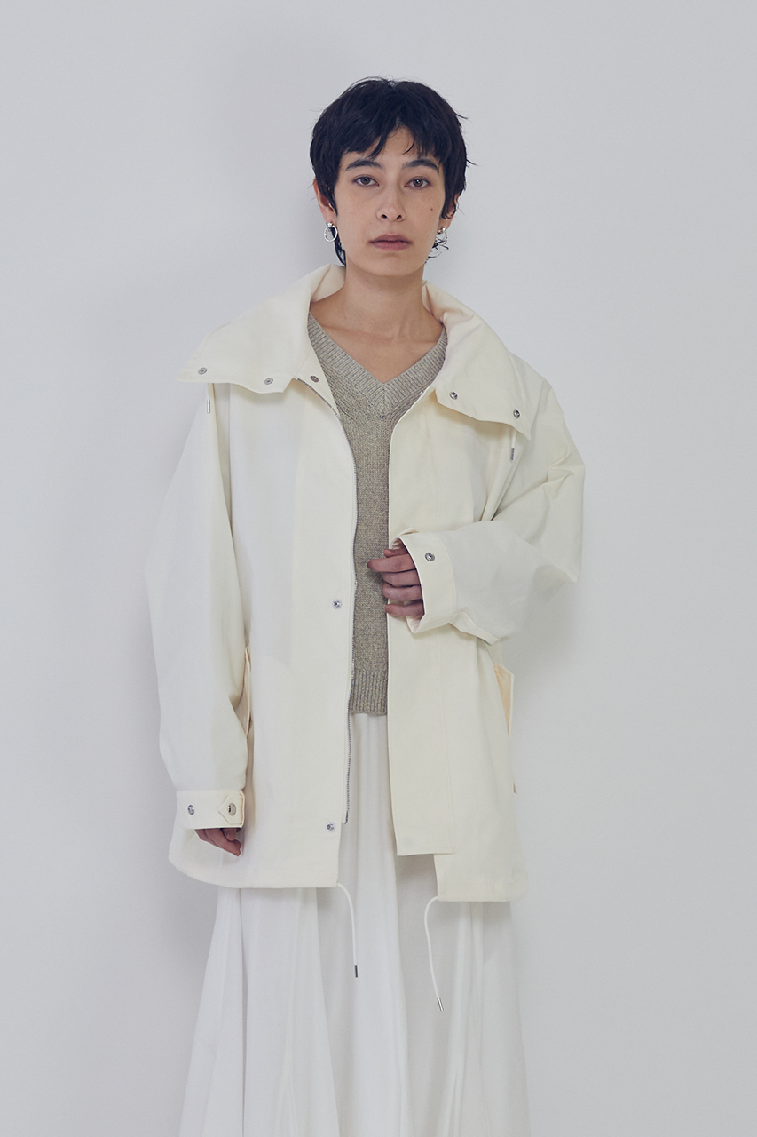 裾には多めに施したハトメとレザーコードを配し、キュッと絞ってフォルム変化が楽しめるデザインに。