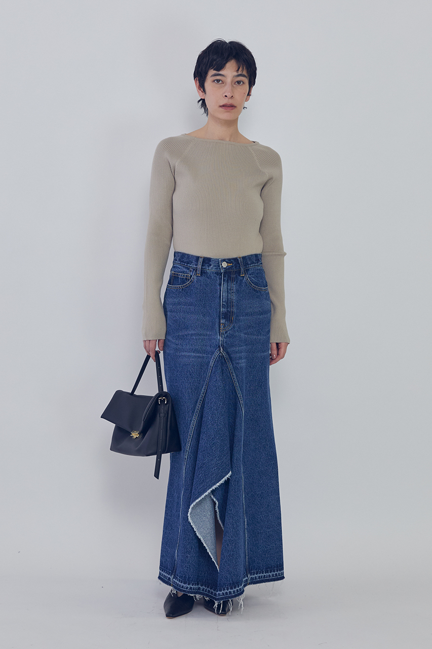 デニムパンツをリメイクしたような雰囲気のデニムスカート。
