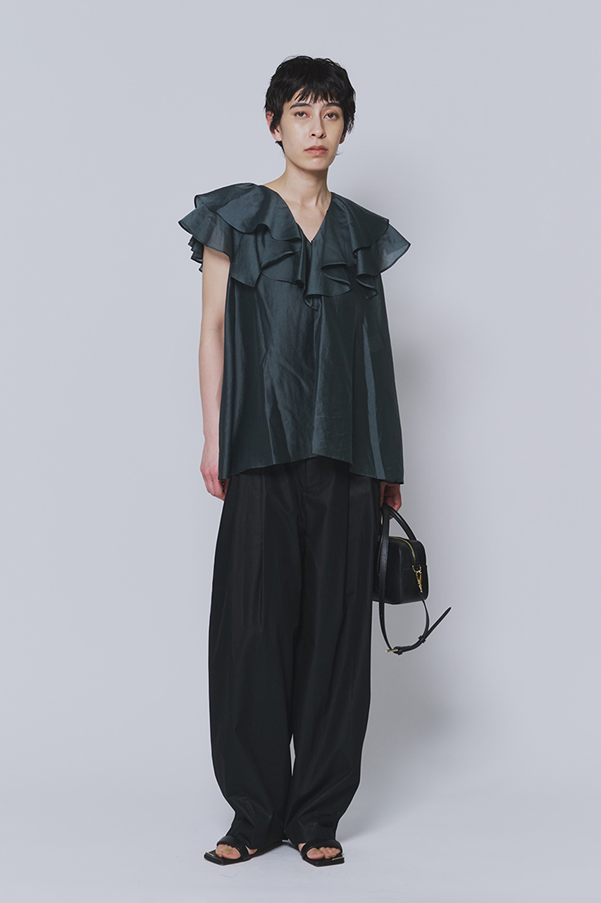 ハリと光沢が美しいシアーテンセル素材を使用し、花びらが何層にも重なるような、やわらかな立体感のあるデザインのブラウス。