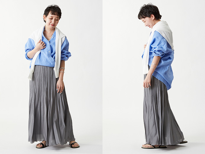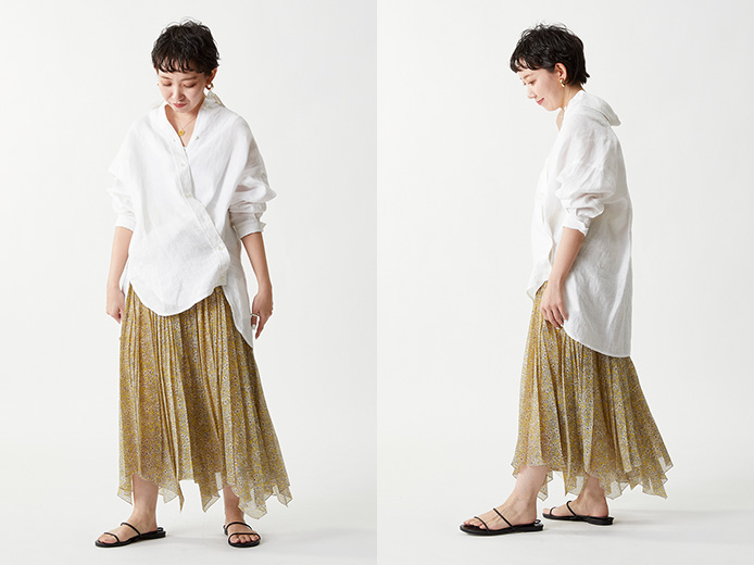 リネンのざっくりとした風合いが、甘めのスカートを中和させるような役割に。