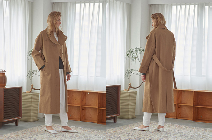 ハリ感のあるボンディング生地で、端正に仕上げたロングコート。フランス軍のヴィンテージコートから着想を得たエッジーなフロントラインと、気分に合わせて楽しめる襟デザインのバリエーションが魅力。また、オリジナルのボンディング生地は裏面素材が配色となっており、カットオフデザインで立体感とヌケ感を表現。繊細なワンピース合わせはもちろん、ナチュラルな風合いのパンツスタイリングなど、クリーンなカジュアルスタイルが今季のおすすめ。