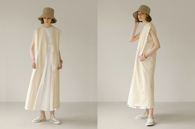 カットオフした袖や襟ぐりが、ミリタリームード漂うジレワンピース。通常のチノより丈夫な生地を使用、ほどよいハリ感が美しい縦長フォルムを実現。また、ソフトな光沢がカジュアルなデザインを端正に仕立てます。夏の着こなしを意識したオリジナルカラーの2色展開。ジレとしてワンピースなどに重ねるレイヤードスタイルはもちろんですが、ボタンを閉じてワンピースとしても着用可能な2WAYデザイン。きれいめな足元合わせでレディなワンピーススタイルを楽しむのがおすすめ。