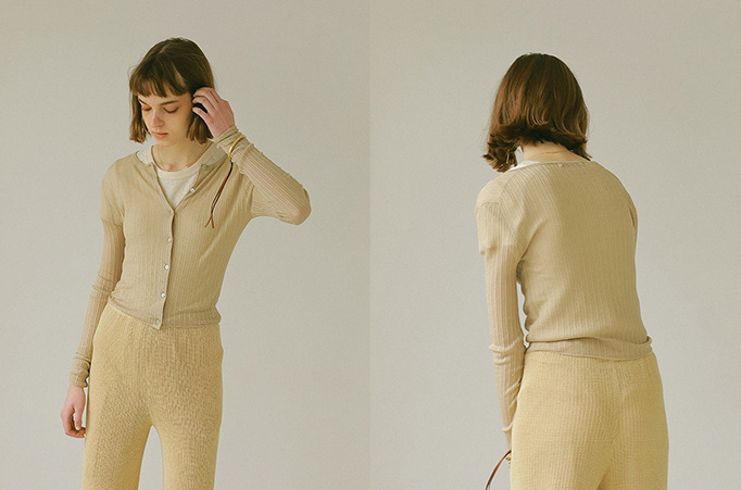 シアー素材でシーズンムードたっぷりに仕上げたリブカーディガン。シンプルになりがちな夏のコーディネートにニュアンスを加え、女性らしさとトレンド感のあるスタイルへと導きます。抗ピル加工を施した糸を撚り合わせた素材は、毛玉になりにくく柔らかい風合いが魅力です。清涼感・吸湿性が高くコンパクトシルエットながら心地よくフィットします。羽織りとしてはもちろん、あえてサイズ感を小さめに設定しているので、肌感をのぞかせるトップスとしても活躍します。第二ボタンまであけてセンシュアルなムードで着こなすのが今季の気分。