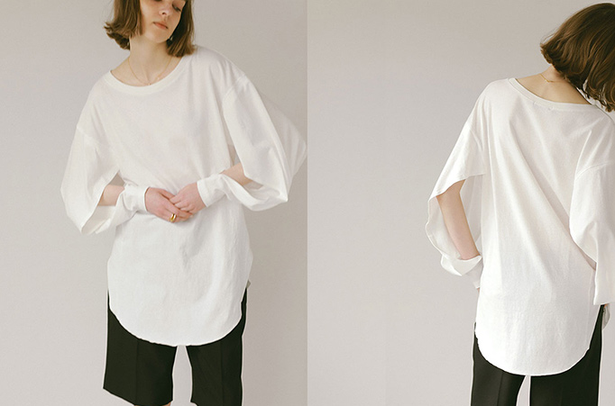 袖下から大胆に肌がのぞくスリットデザインが、涼しげな見た目と洗練度の高い着こなしを叶えるプルオーバー。USコットンを多く含んだ生地を製品染めすることによって、ヴィンテージライクな風合いに仕立てました。シンプルなフロントデザインにヒップが隠れる長めの着丈は、合わせるボトムスを選ばず、こなれ感のあるカジュアルスタイルへと導きます。ルーズなフォルムを生かす細見のボトム合わせで抑揚のある着こなしがおすすめ。