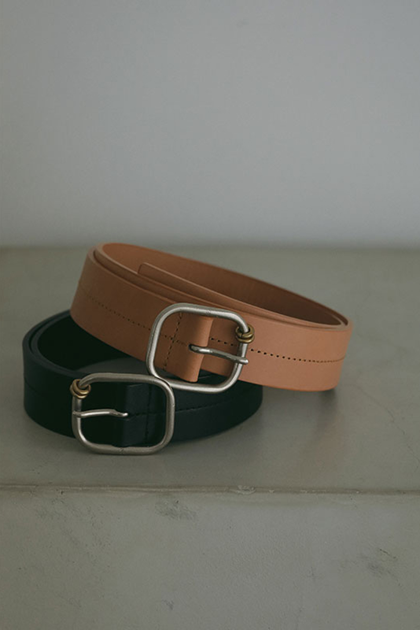 センターに施されたステッチが、ほどよくカジュアルなアクセントに。丸みを帯びたスクエア型バックルにゴールドのリングを重ねたデザインが、シンプルながらもスタイリングに洒落感をプラスします。