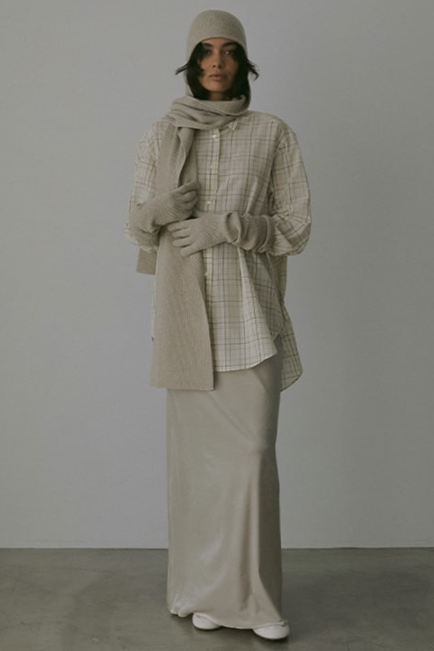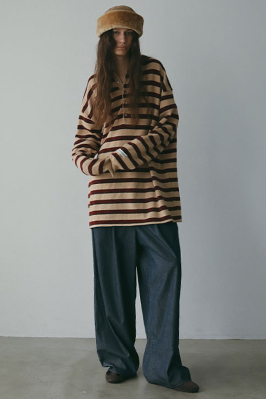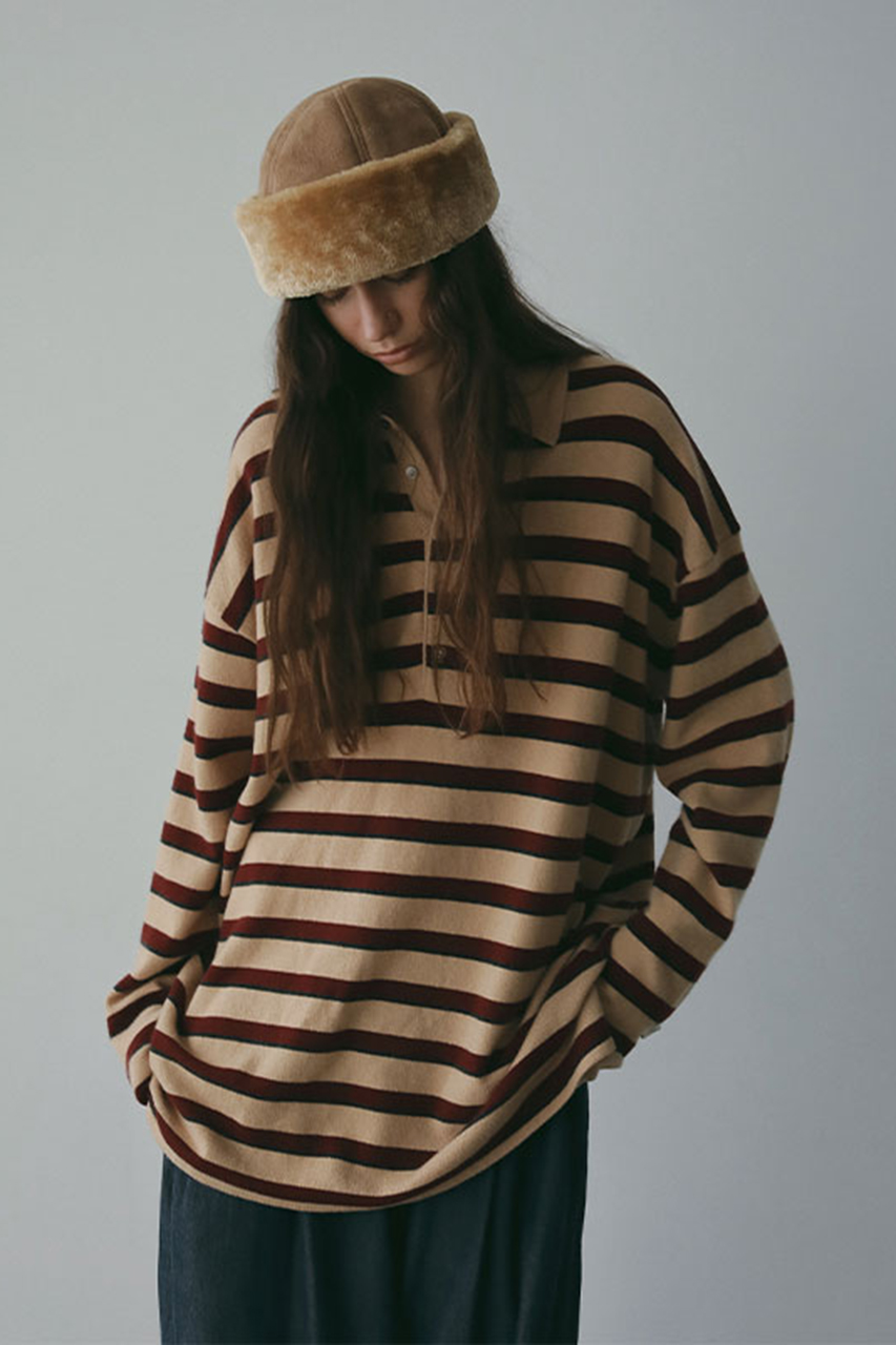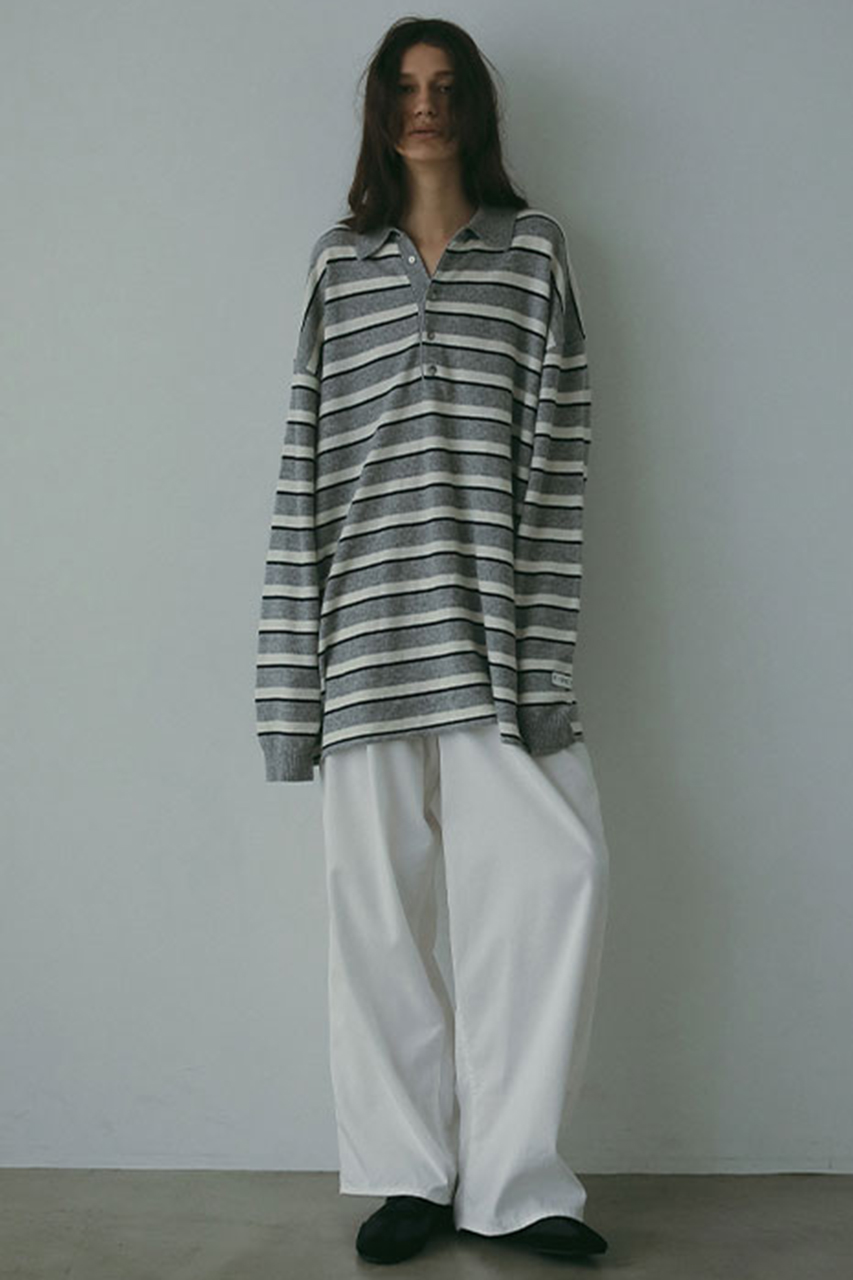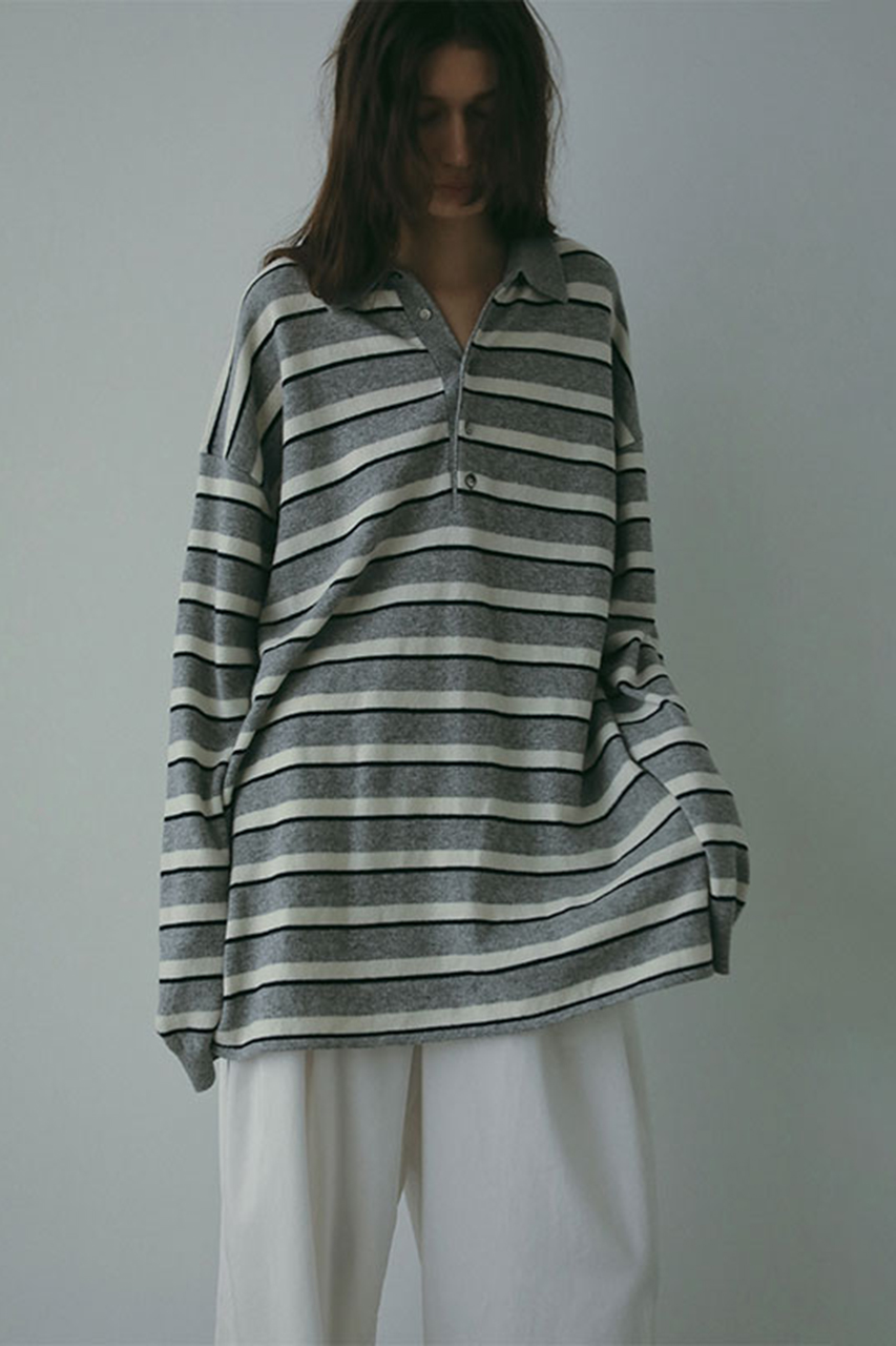 柔らかく、しなやかな肌触りが魅力のメリノウールを100%使用。ラガーシャツを思わせるカジュアルな雰囲気に、上質な素材感が絶妙なバランスで抜け感を演出します。ややゆとりのあるサイジングと、身体のラインを拾いすぎないシルエットは、着る人を選ばず大人の女性のライフスタイルにもフィット。袖先にはニットのジャガードネームを施し、さりげないアクセントをプラスします。