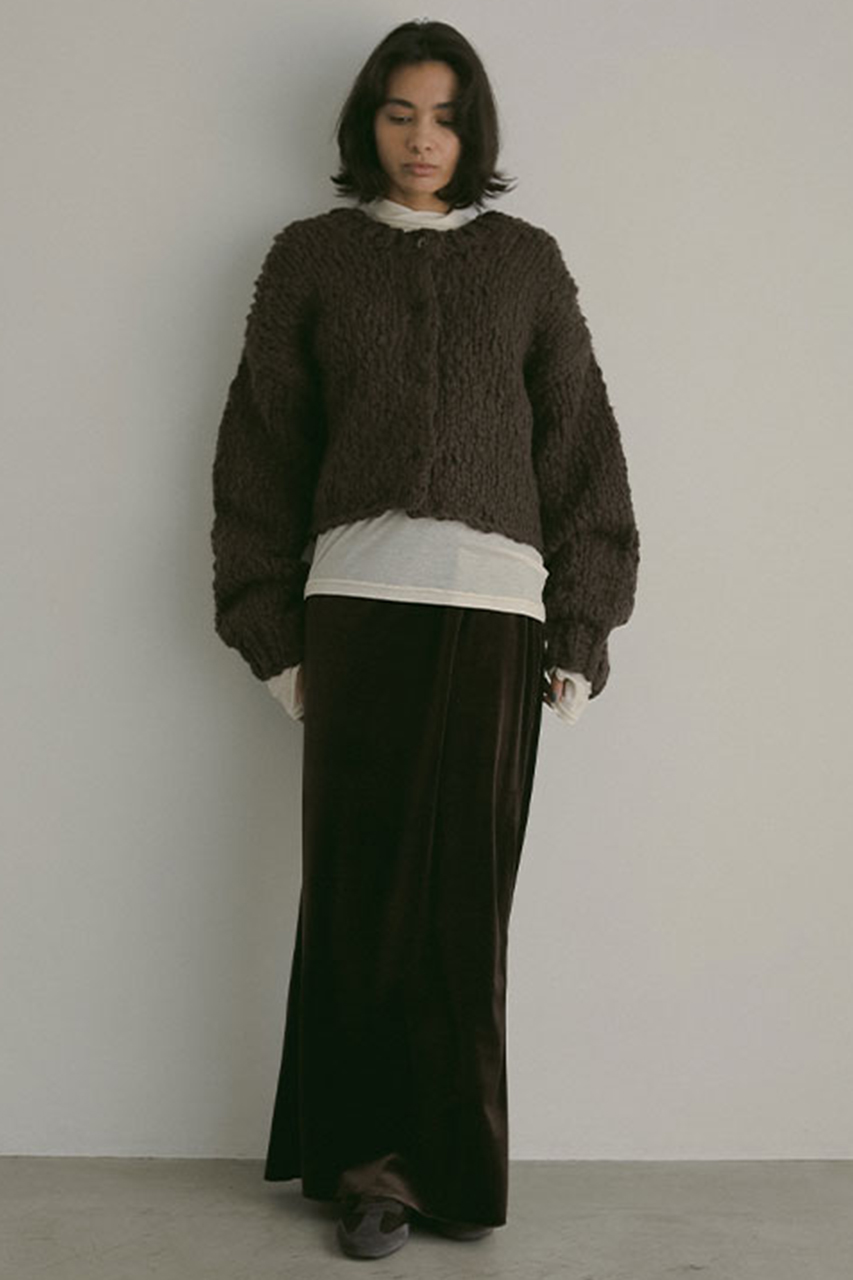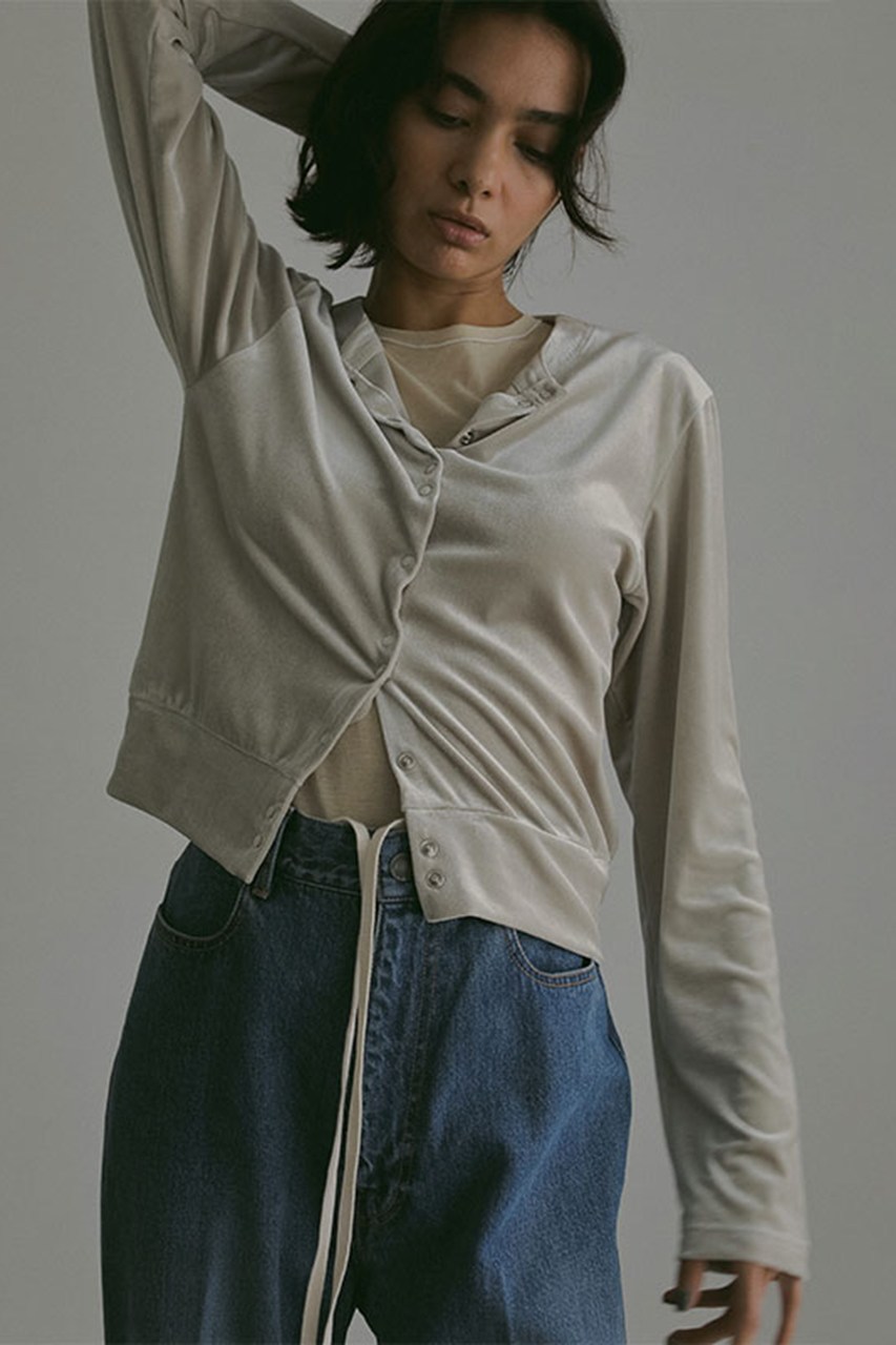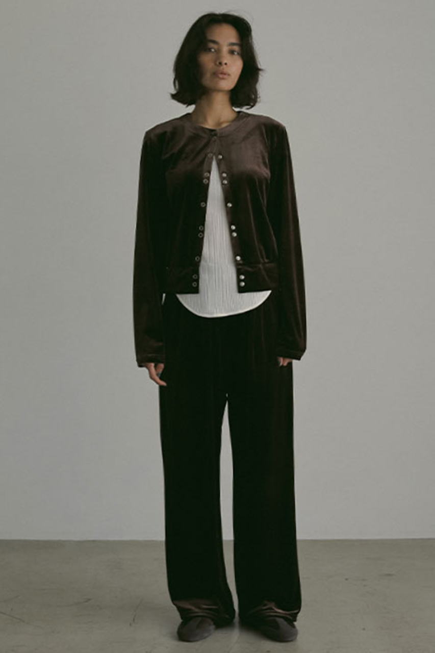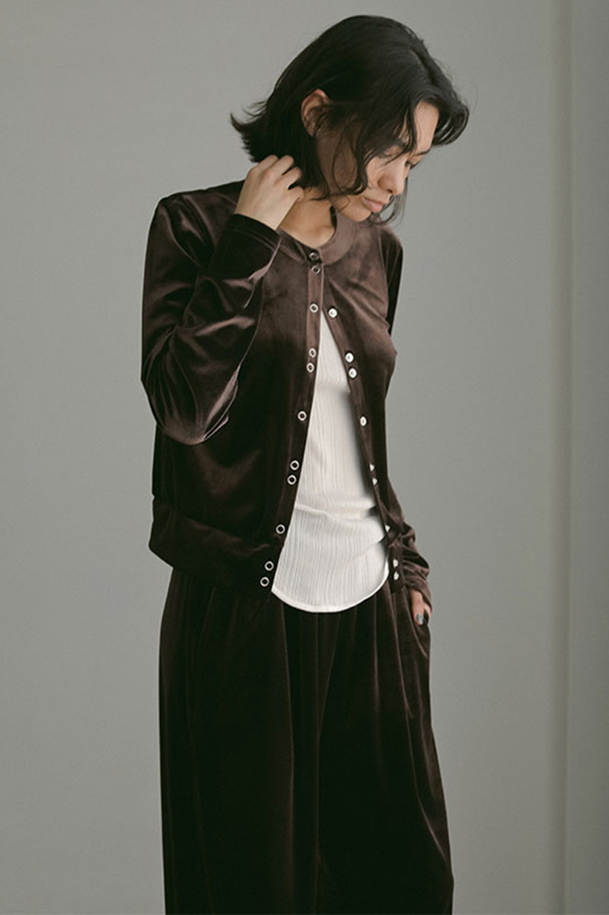 同素材のリラクシーベロアパンツやIラインベロアスカートとセットアップで着こなせば、統一感のあるスタイリッシュなコーディネートが完成。
