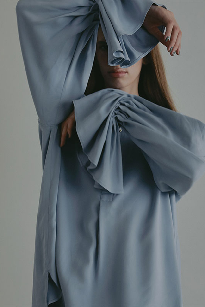 袖口にランダムタックを施すことで、甘さを抑えたモードな印象に仕上げています。しなやかに揺れる袖の動きが静かな存在感を添える一枚。フロントにはナチュラルな表情のボタンをあしらい、ほどよいアクセントに。