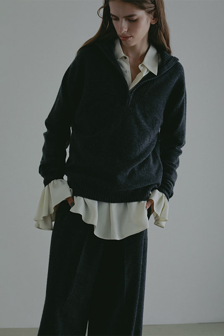 メリノウール混の梳毛細番手糸を使用、さらりとした肌触りと暖かさを兼ね備えた1着。ほどよい厚みで快適な着心地を実現します。フロントはジップ仕様で、シンプルながらもモードな印象にデザイン。