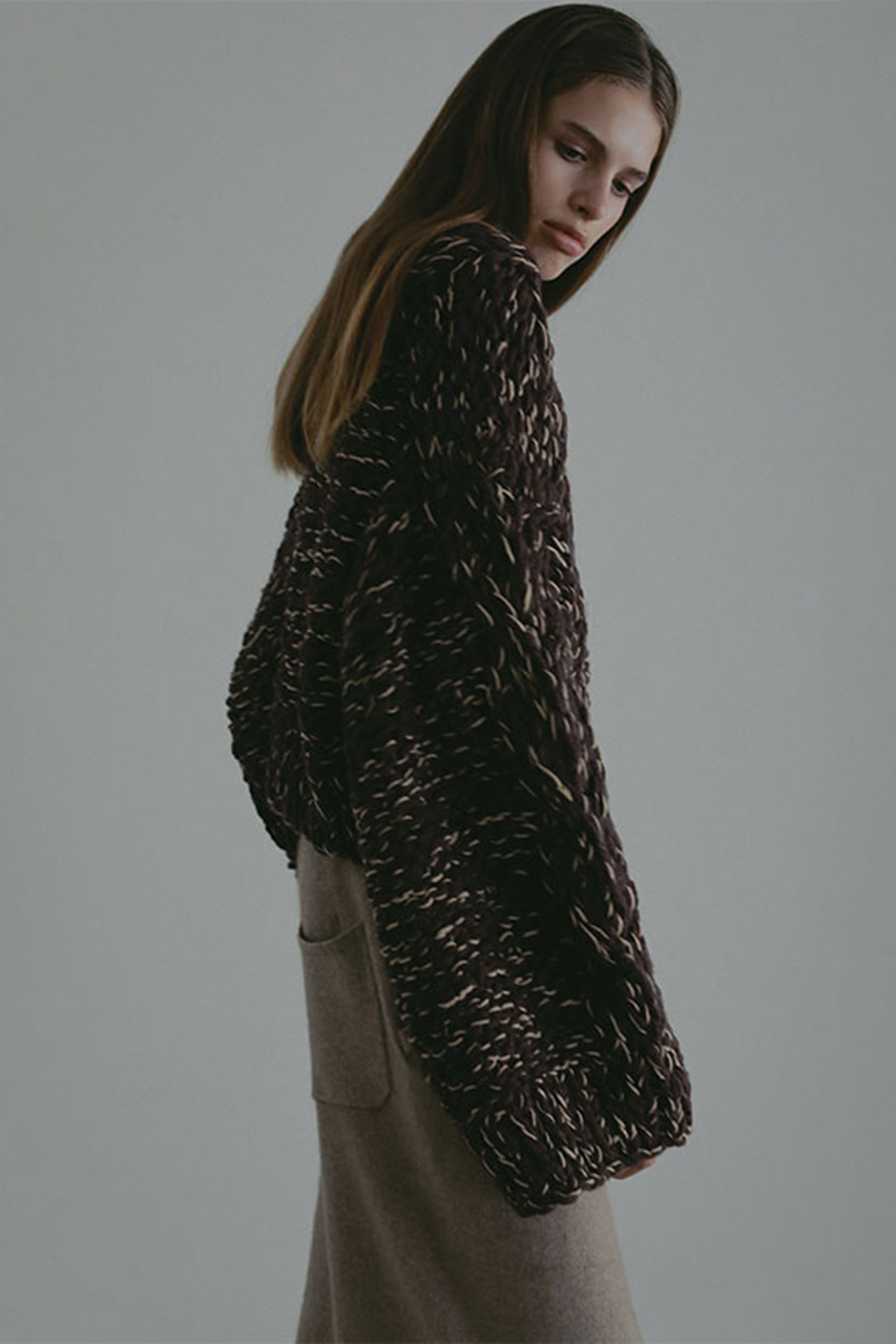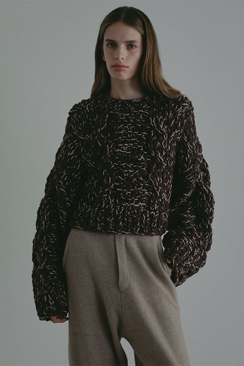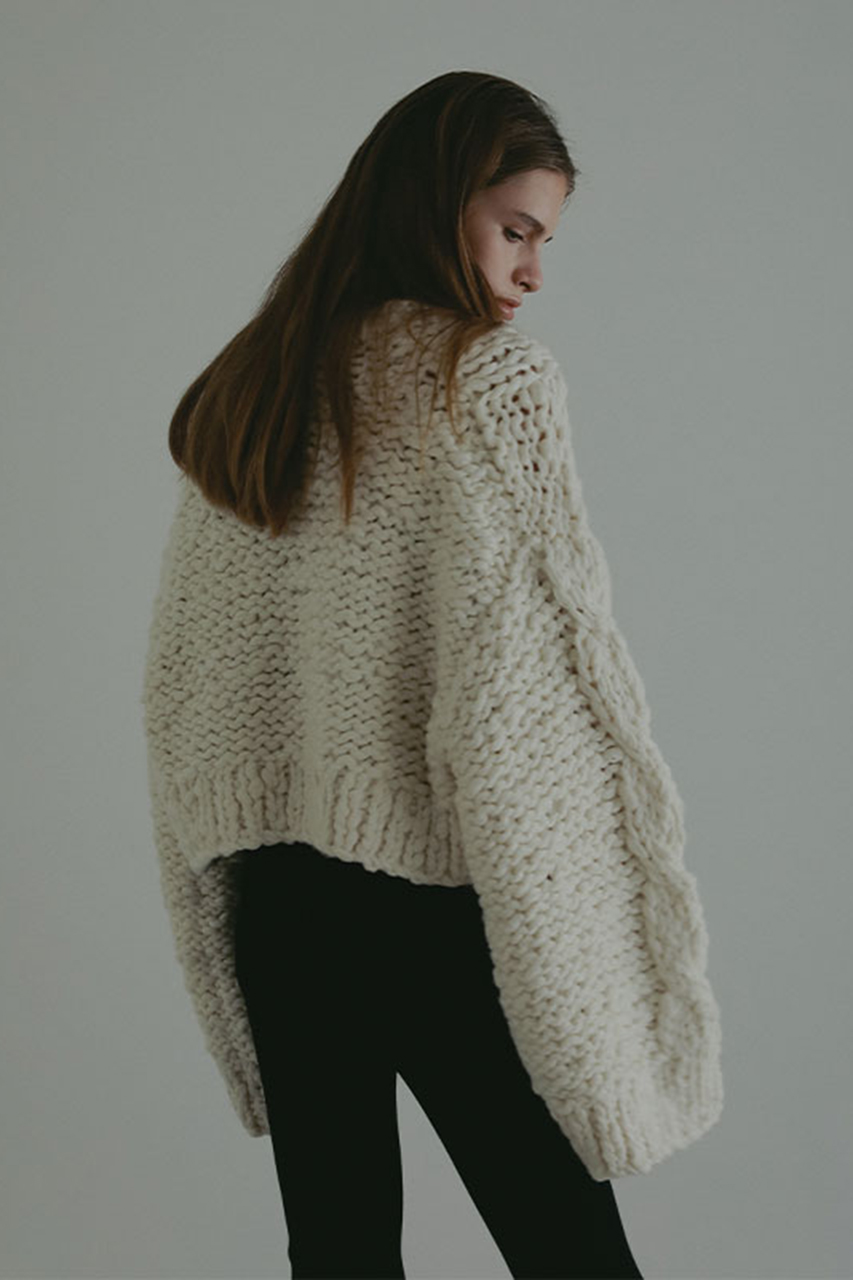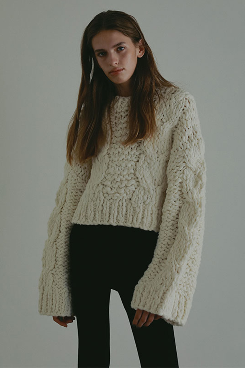 ざっくりとしたスラブ糸を贅沢に使用し、ハンドニットで丁寧に編み上げたケーブルプルオーバー。