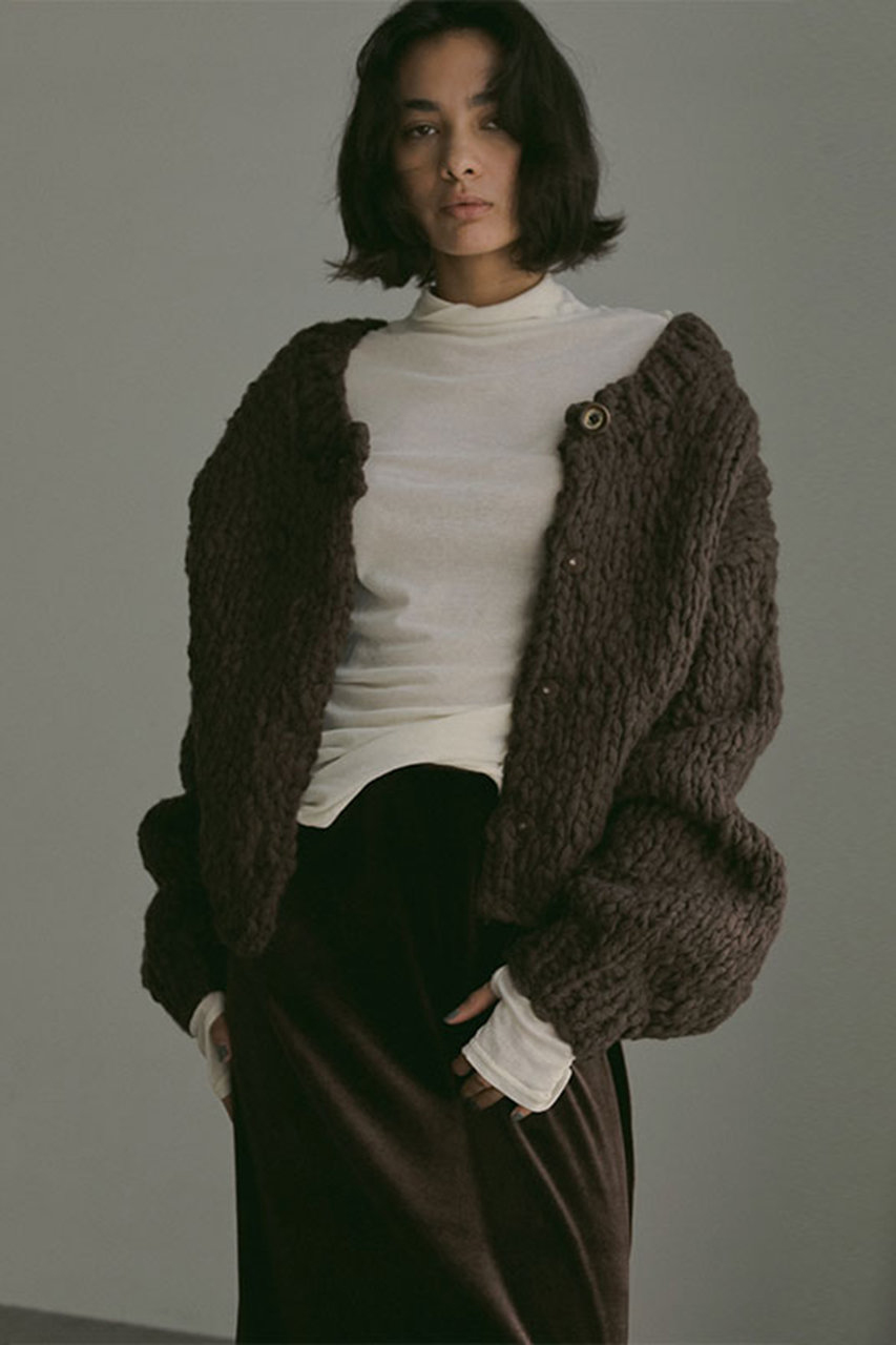手編みならではの空気を含んだような軽やかさとウール混のほどよい保温性で、デザイン性だけでなく実用性にも優れた一枚に仕上がっています。