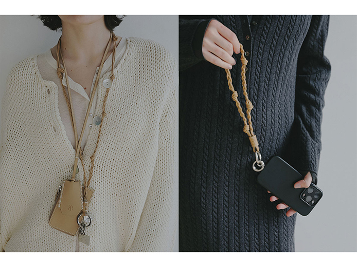 スクエアパースキーホルダー、レザーコードショートマルチストラップともベージュ・ブルー・ブラウンの3色展開。