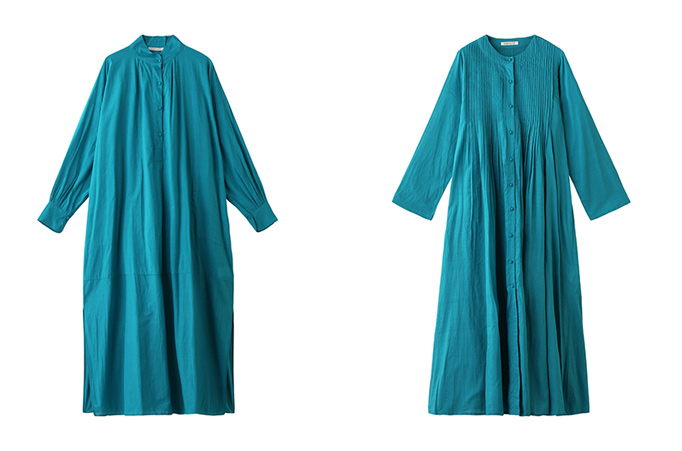 インド特有の手つむぎ手織りの“カディ”を使用した「ハウス オブ ロータス」で人気のカディコットンシリーズ。機械織りとは異なり、ところどころに糸のムラがあるふわっと空気を含んだ風合い、使うほどになじむ柔らかな肌触りが魅力です。通気性のよさや軽さ、柔らかくシワになりにくいので、旅先にもおすすめ。今シーズンは、細かいタックとフレアでたっぷりとボリュームを出した美しいシルエットのロングワンピースと、高めのスタンドカラーとマスキュリンな印象のボックスシルエットのシャツワンピースで展開。どちらも、ミラーワークパンツやシルクフリルパンツなどのアンダーパンツとのコーディネートもおすすめ。