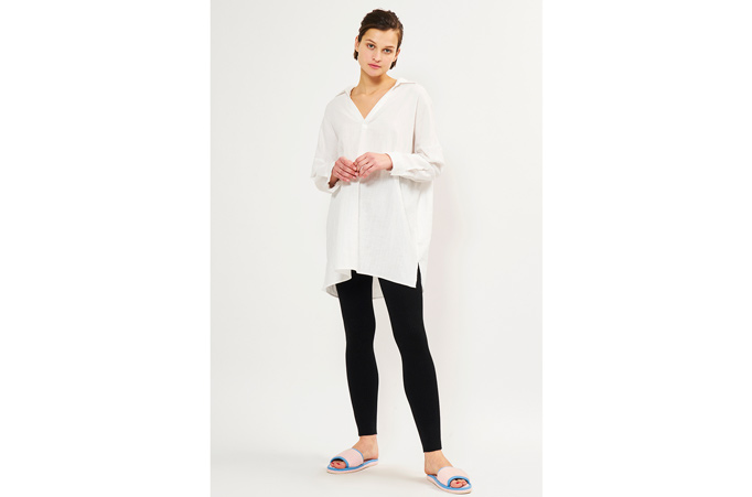 ホールガーメントという特殊な機械で編んだレギンス。綿シルクをブレンドした糸で仕上げているため、さらりとした肌触り。ストレッチ性のある生地なので動きやすく、身体に優しくフィットする。ルームウェアにぴったりの快適なはき心地。生地は程よく厚みがあるため、ボトムスとしてタウンユースに活用できるのもうれしいポイント。