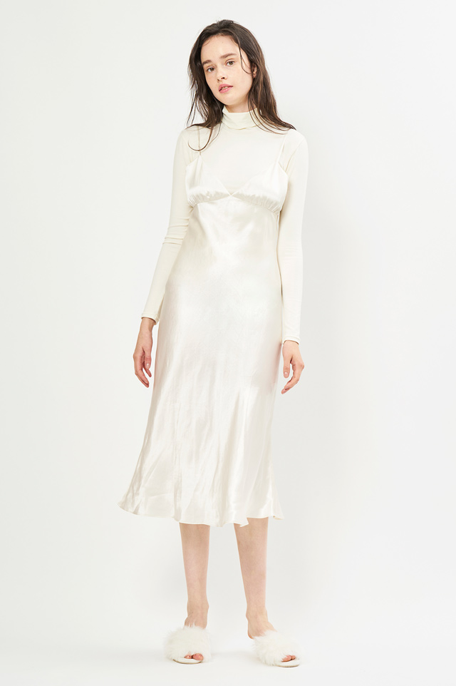 光沢感のあるサテン生地と程よくフィット感のある細身シルエットが女性らしさを醸し出すスリップドレス。シルクタッチで吸水性・吸湿性に優れたeco素材で仕上げたこだわりのアイテム。大きめにあいた胸元や華奢なストラップもポイントに。インナーとしてはもちろん、中にカットソーやパンツなどを合わせてレイヤードスタイルを楽しむのも◎。