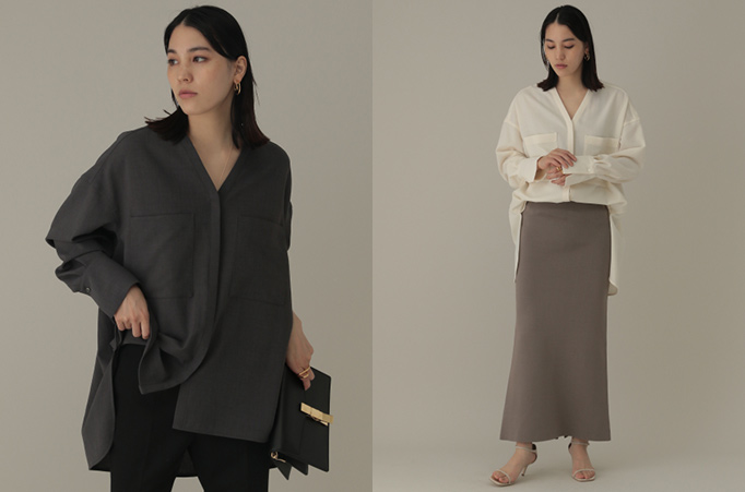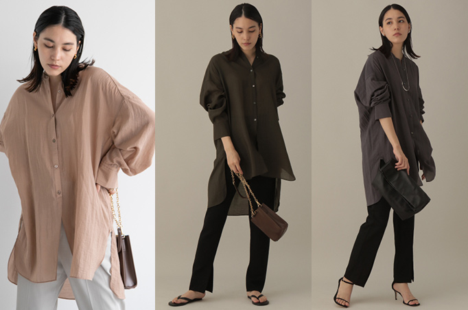 オーバーサイズでシアー感のある素材を使用したバンドカラーのデザインは、ほどよく女性らしさがあります。少し長めの着丈が新鮮で、パンツとのコーディネートがおすすめです。フロントのボタンをあえて下まで付けずスリットのようにデザインしているので、パンツとのスタイリングが単調にならず、バランスがとりやすいです。