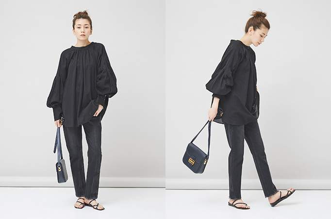 タウンには、ベーシックなデニムに上品なバッグを合わせたシンプルなスタイリングがおすすめ。ボタンを後ろに着用する際は一番上のボタンをあけてバックスタイルに女性らしさをプラスした着こなしも◎。