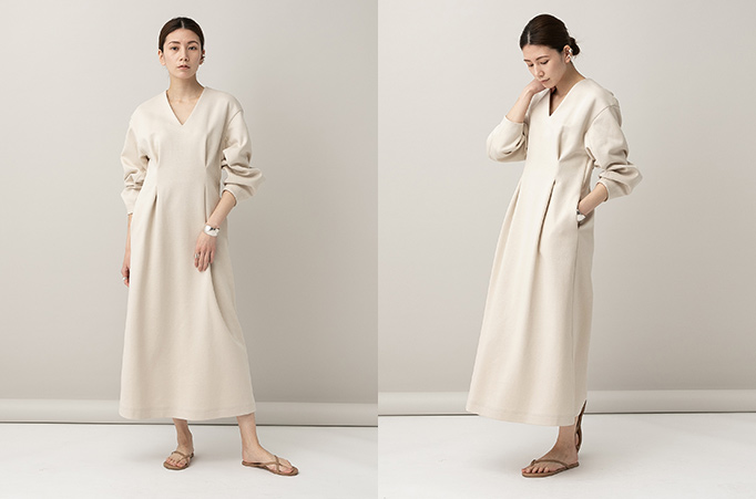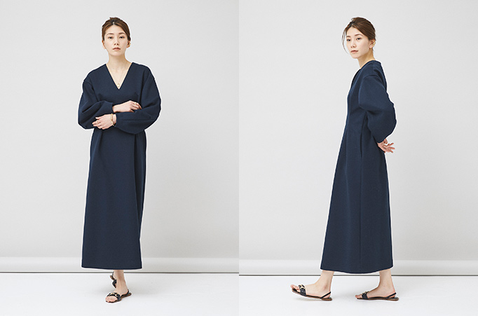 タックをとったウエストと、丸みのある立体的な袖がポイントのロングワンピース。カジュアルすぎないルックスの秘密は、美しい表面感が魅力のダンボールニット素材を使用しているから。デイリーからタウンユース、ちょっとしたお出掛けまで、シーンを選ばず着用いただける一着に仕上げました。