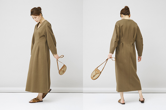 一枚で着るのはもちろん、小物使いでカジュアルにも着やすいカーキは、デイリー使いにもおすすめ。タックをとったウエストと、丸みのある立体的な袖がポイントの女性らしいワンピースなので、キメすぎないさりげないおしゃれが叶います。