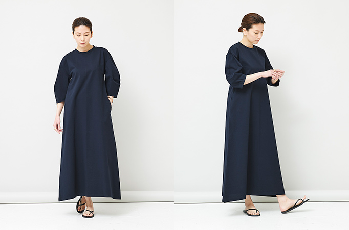 しっかりとした立体感のあるシルエットを作り出す着心地のよいカットソー素材で仕上げたサマーワンピース。さらっとした着心地が夏にぴったりです。ダーツを入れた丸みのあるパフスリーブと、対照的にすっきりとした身頃とロング丈のシルエットの大人っぽいバランスにこだわりました。シンプルなデザインでデイリーユースからタウンユースまで、シーンを問わず着用できる夏のマストアイテムです。