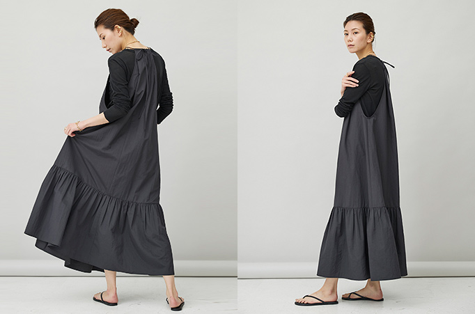 裾にたっぷりとギャザーを入れ、甘めなディテールを取り入れながらも素材感とミニマルな首周りにすることで大人女性にぴったりなデザインに仕上げたキャミワンピース。後ろの紐で着丈の調節が可能で、シーズン問わず着用できる素材感もポイント。