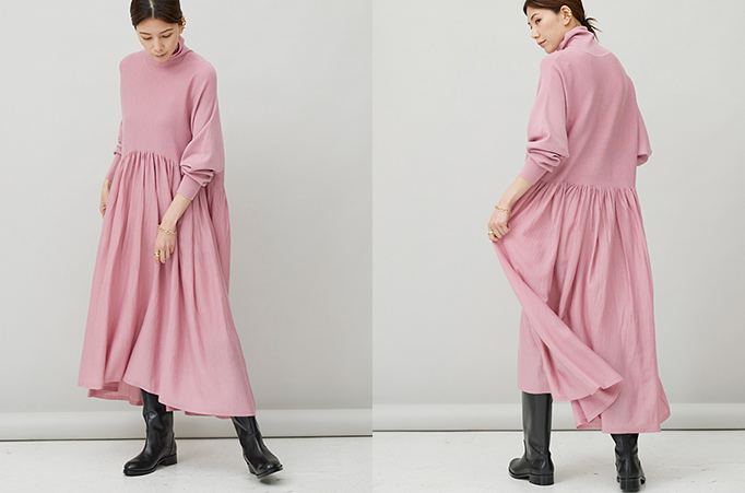 >>ウールハイネックギャザーワンピース ピンク