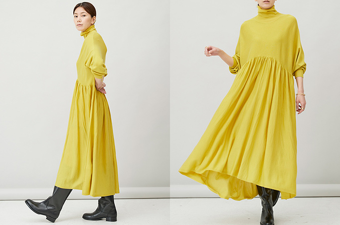 >>ウールハイネックギャザーワンピース イエロー