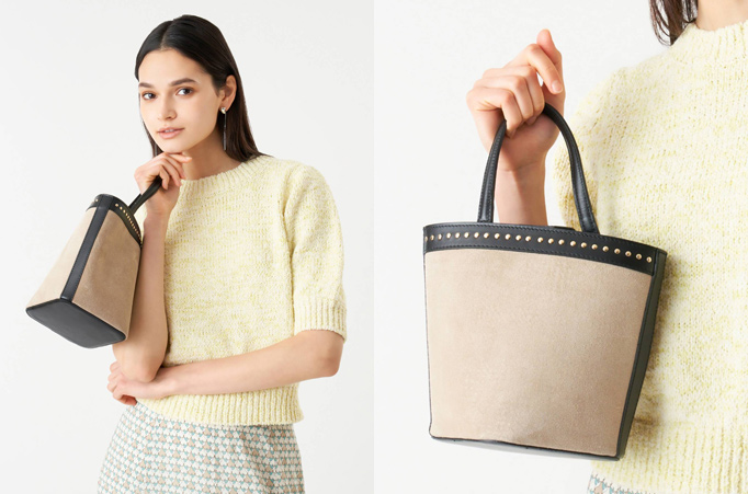 上質なスエードに華奢なスタッズを取り入れたモダンな印象のバッグ。柔らかな印象のベージュにブラックの配色使いがアクセントに。様々なスタイリングに合わせやすいカラーと絶妙なサイズ感が、デイリーにもマッチするアイテム。