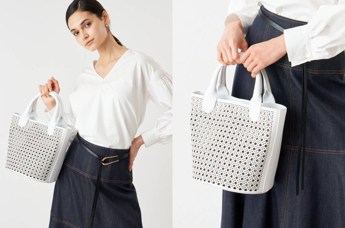 華やかなカットワークが目を惹くエレガントなバッグは、洗練された印象のホワイトと優しいベージュの2色展開。ディテールにこだわり、繊細かつリラックスした雰囲気を演出するデザイン。デイリー使いしやすいカラー展開と、華奢に見えながら収納力のあるサイズ感もポイント。
