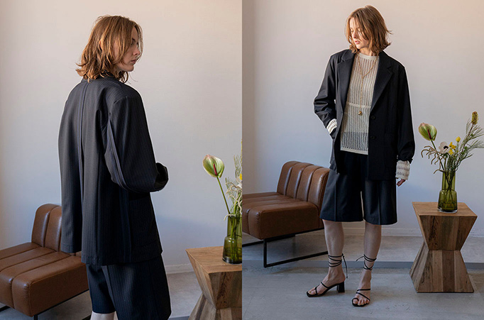 ショーツ合わせのセットアップはどこかヌケ感もあり、子供っぽくなりすぎない大人な着こなしに。あえてシームを外に出したデザインがポイントのジャケットはゆったりとしたシルエットで、こなれた印象を生んでくれます。リラクシーな雰囲気のワイドショーツはひざが少し隠れる丈で落ち感もきれいな一本。