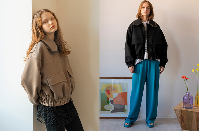大きなスクエアカラーをポイントにして、ボリューム感をもたせることで存在感を出しつつもショート丈でバランスをとった一着。ウールライクなふくらみ感のある表情で、上品さはありつつもすっきりとした素材です。軽くストレスフリーな着心地で、ロングシーズン着用可能。